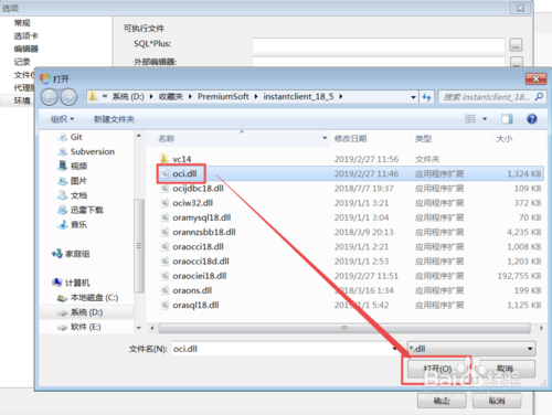 2.2、选中 D:\Favorites\PremiumSoft\instantclient_18_5\oci.dll