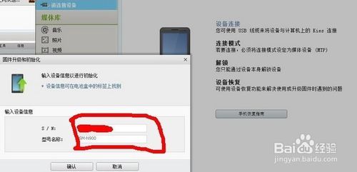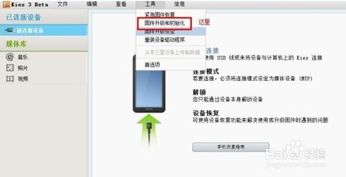 再次来到kies界面,选择“工具”,然后选择“固件升级和初始化”,此时输入上面记下的型号