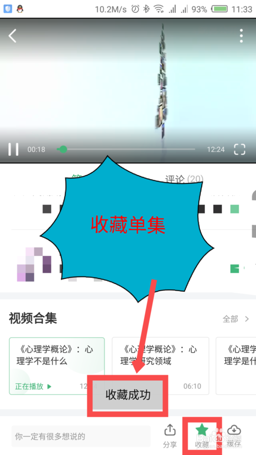 5、点击收藏后,同样会有文字提示收藏成功,收藏的图标也会有变化,视频就收藏成功了。如图所示