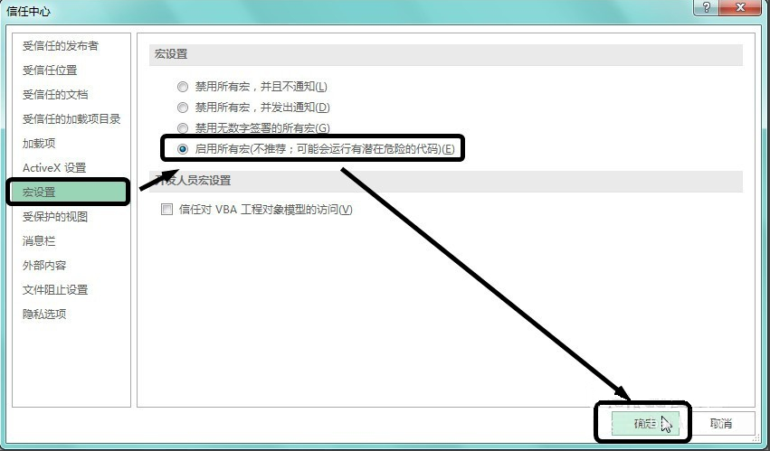 4、在弹出的Excel信任中心设置界面中,点击左侧的“宏设置”选项,在右侧宏设置选项中点击“启动所有宏(不推荐,可能会运行有潜在危险的代码)”选项,选择完成后点击【确定】按钮。