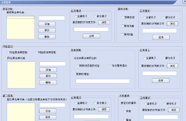 5.可以对客户机进行进程黑名单控制,设置不想运行的软件程序;可以对客户机进行窗口黑名单控制,含有指定文字的窗口将无法显示;可以对客户机进行网址黑名单控制,当访问网址黑名单中的地址时可以直接禁止或者跳转到设定的地址;可以远程管理客户机软驱/光驱/U盘等硬件的使用。
