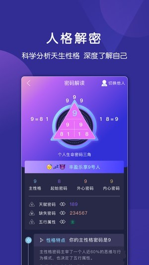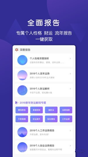 1、个性化单人解读用户只需完善生日信息,就能获得即时报告,包括个人生命密码排列和基本解读、深度的性格和行为模式解读、新年运势、流年财运、事业、感情……全部都写在报告里。