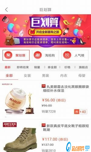 【巨划算】 聚划算活动基础上,还能再领券,享折上折优惠。更有淘抢购、超人气榜版块。