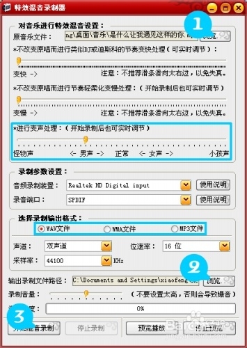随后,点击下图标签2-“浏览”按钮设置好音频文件的保存路径,然后点击标签3-“开始混音录制”按钮进行男女变声就行了。同时,软件还人性化地设置了“停止录制”“预览播放”等等功能,让男女变声步骤更加便捷!