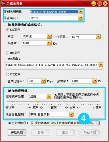 然后,我们在下图第二个蓝色选框处将变声功能启用,灵活调节男女变声控制条。然后,选择好自己需要导出的音频格式,点击标签4-“浏览”按钮设置好音频文件的保存路径。最后,点击“开始录制”按钮进行录制就行了~