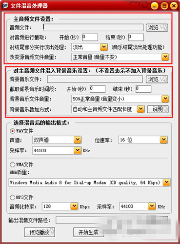 2、用户可以利用之前在混录天王中的录音功能,比如自己在麦克风清唱,再找到这首歌的背景音乐,在这里就可以将自己录制的声音和背景音乐进行混音了,在混音时,还可以对音频进行各种设置,如截取音频、淡入淡出处理、音量处理等等,功能非常齐全,用户只需要在“主音频文件设置”中添加你已经录制好的原唱音乐,之后在从上往下数的第二个红框中添加伴奏音乐,最后点击“开始生成”选项即可完成原唱和伴奏的混音,如下图所示: