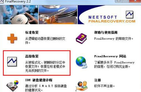 2、插入u盘,运行数据恢复软件。在打开的程序首页界面中,点击“高级恢复”项。