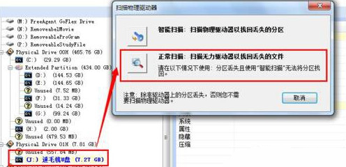 3、接着在程序主界面中,点击u盘所在盘符,并在弹出的窗口中选择“正常扫描”项。