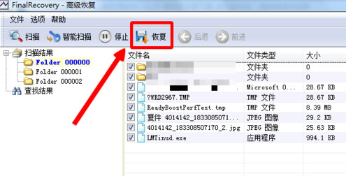 4、待扫描完成后,勾选要进行备份的数据,点击“恢复”按钮,并选择保存位置即可完成u盘数据的备份。
