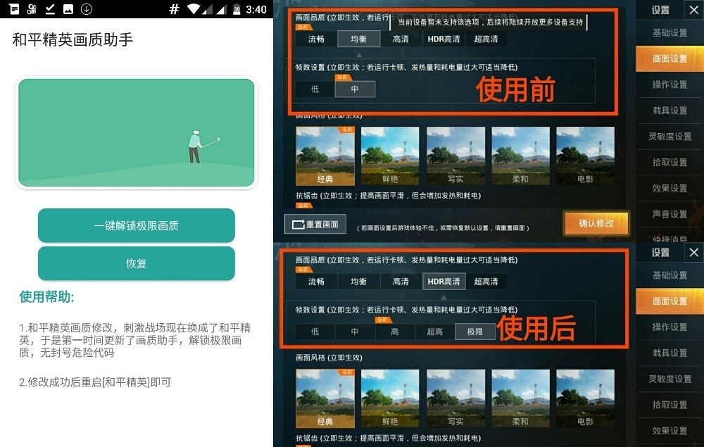 和平精英画质助手可以一键解锁和平精英所有画质,为玩家提供完美游戏画质,支持极限画质修改、高帧率修改、画质优化等功能,操作全程安全、稳定、流畅,没有任何封号风险,最大帧数限制全解锁,让大家玩游戏更加随心!【软件特色】