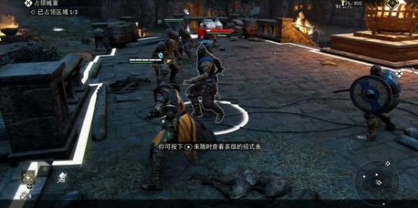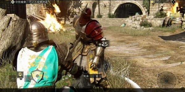 沿楼梯到下层城墙,在这里遭遇到两名敌军的英雄,这里熟悉一下锁定目标的切换,以及防御模式和攻击方向的调整。