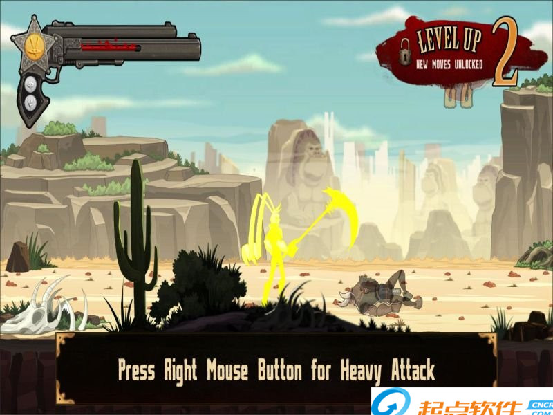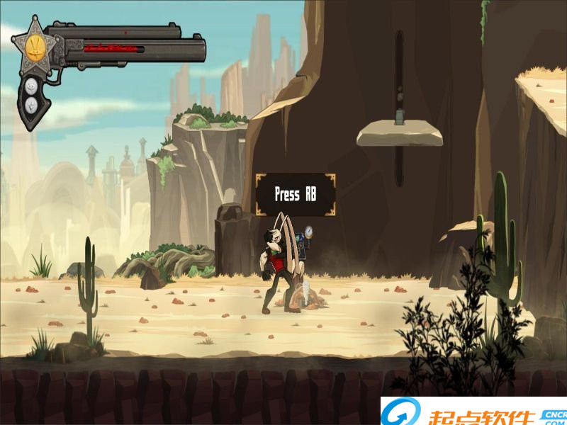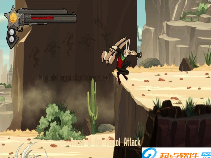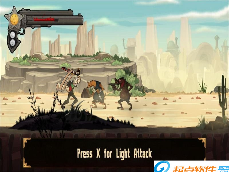 step2.继续往前走,落下沙地,走到中部,会遇到一只拿枪的老鼠和一只拿刀的黄鼠狼,游戏提示最好近距离对他们按住B键使用散弹枪,将他们击飞(推开)然后再使用连续的X键轻击。