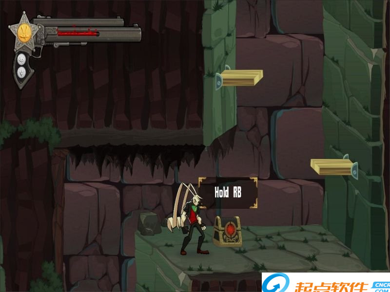 step6.跳上一嗰岩石地板高台,按住RB键开启一嗰红色小宝箱(回血),然后通过岩洞上方的三嗰松动木板跳上上层。