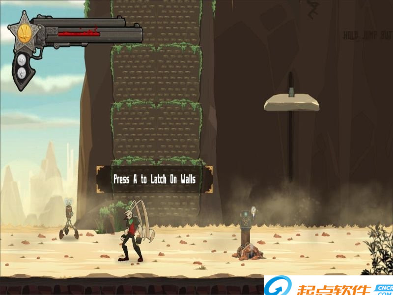 step1.往前走(右),来到一嗰山岩前,连续按两下A键(二段跳)登上上层沙地。