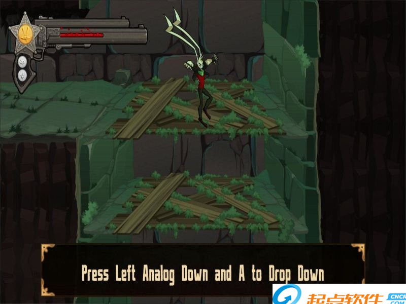 step10.来到矮洞右端,站在两层木板上,按住↓键加A键(2次),可以跳往下层。到达下层后,会遇到一只蝙蝠,达斯蒂可以站在左侧的高台对着飞行中的蝙蝠进行B键的射击。又或者是跳到蝙蝠的位置,以大范围的镰刀空中连击击倒蝙蝠。当蝙蝠跌倒地上,就改用连续的轻击,防止它再次飞起来。