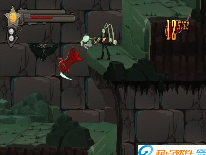 step11.通过蝙蝠后,往右侧前行,跳落两段楼层后,会再次遇到蝙蝠,此时会有两只蝙蝠。同样站在右侧的高台上,对着飞行中的蝙蝠进行B键的射击。又或者是跳到蝙蝠的位置,以大范围的镰刀空中连击击倒蝙蝠。当蝙蝠跌倒地上,就改用连续的轻击,防止它再次飞起来。