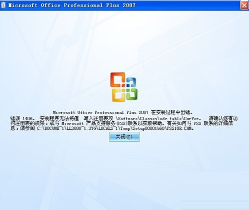 状况二:我们在安装office2007的时候,会出现以下信息,错误1406,安装程序无法将值写入注册表项,需要联系管理员权限,导致无法安装。