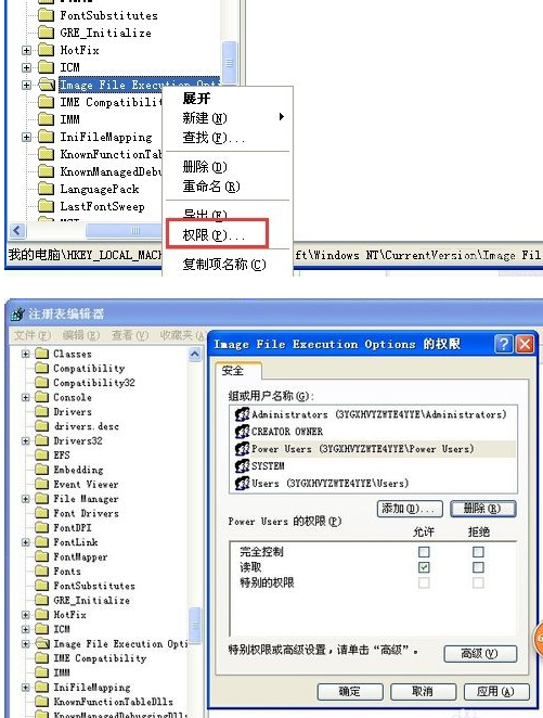 右键点击ImageFileExecutionOptions,在选中菜单中点击“权限”选项,跳转到权限维护;