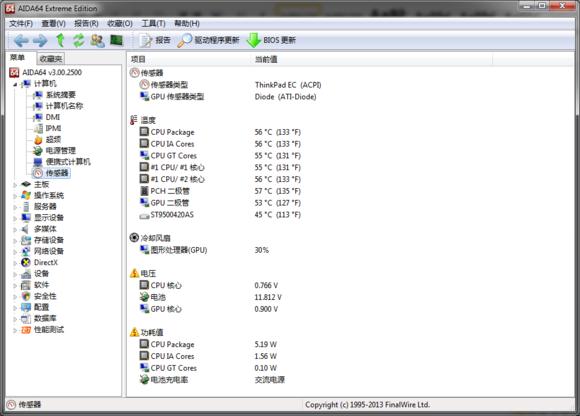 温度检测。计算机-传感器下可以看到各项的即时温度和功耗值。