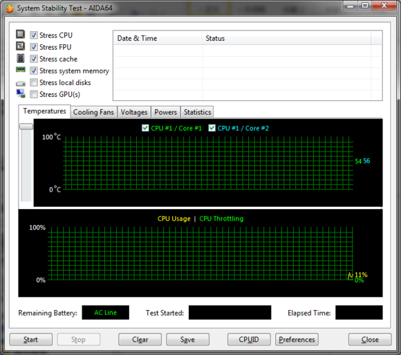工具-系统稳定性测试。左上角是要测试的项目,一般选CPU、FPU、cache就可以了,也可以选上GPU双烤。一般认为,待机低于60度,满载CPU不降频(可以不睿频但是要保持基本频率,从图上来看就是下表的CPU Throttling曲线一直为0%)就是没有问题的。