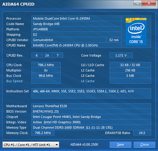 新版的图标排版稍微有点改变。一个重要的功能就是检测CPU封装类型是PGA还是BGA,也可以帮助判断是否是BGA加脚。在Platform里面一栏,“rPGA988B”说明是PGA的,而另一张图里面的“BGA1023/1224”是BGA的。顺便说一句(至少)二代酷睿i5/i7是可以支持DDR3 1600的.