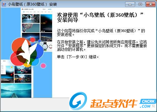 先从起点软件园下载,点击打开文件夹找到下载的压缩文件,解压后打开安装文件,出现安装界面:我们进入到小鸟壁纸安装向导。将指引你完成小鸟壁纸的安装进程。在开始安装之前,建议先关闭其他所有应用程序。这将允许“安装程序”更新指定的系统文件,而不需要重新启动你的计算机。点击[下一步]继续安装;