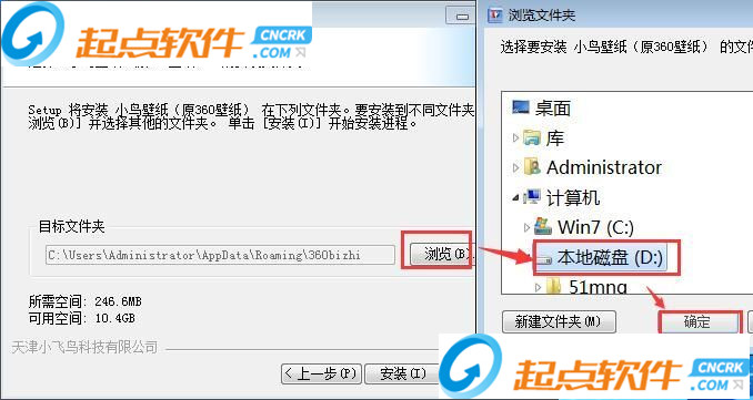 这一步我们需要选择小鸟壁纸的安装路径,安装向导有提供默认安装路径,需要自定义安装路径的朋友们可以点击[浏览],选择好安装路径之后点击[确定]就可以修改安装路径了。点击[安装]就可以将小鸟壁纸(原360壁纸)安装到电脑里面了;