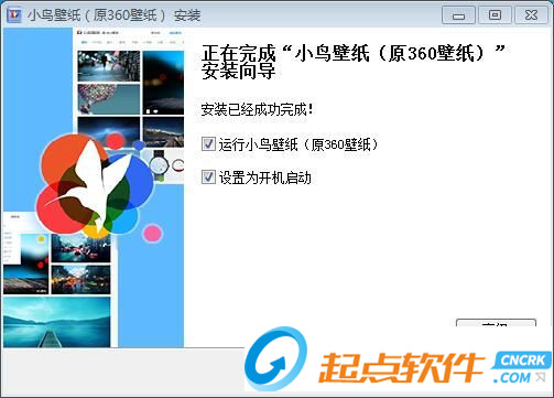 安装完成,安装向导现在会提示小鸟壁纸(原360壁纸)安装完成,有三个勾选项分别是运行小鸟壁纸(原360壁纸)、设置为开机启动和加入用户体验计划,勾选后会在安装向导退出的时候执行,根据使用需要勾选即可。点击[完成]退出安装向导。