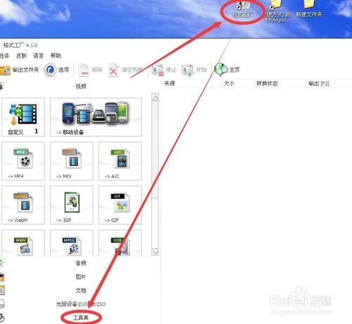 1、首先需要点按格式工厂图标,进入格式工厂软件界面,然后点按界面下方的工具集合标志。