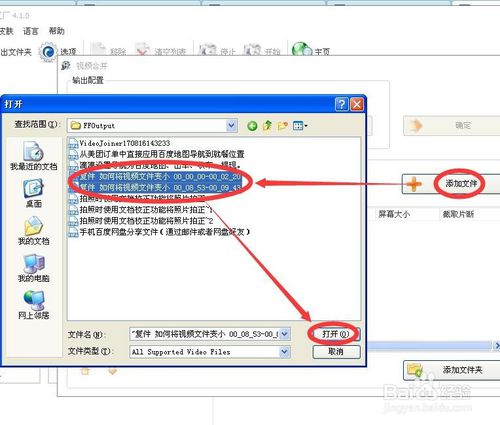 4、点按完添加文件之后在弹出的打开窗口中找到需要合并的文件,然后按住ctrl键,选中需要添加并合并的两个视频文件,然后点按界面下方的打开标志。