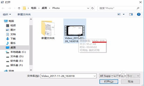 3、然后打开视频目录找到视频文件,点击下面的打开。
