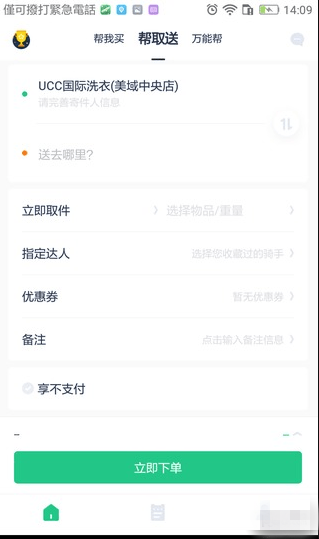 用户可随时随地发布速递需求,如:帮我取一个快递帮我送一个文件帮我买两份早餐等等,为用户解决此类生活中的速递琐事。