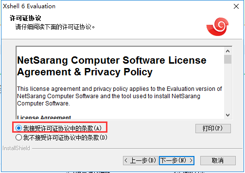 2、进入Xshell安装许可协议界面,您可以先阅读协议中的条款,阅读完成后,点击“我接受许可协议中的条款”,然后点击【下一步】。