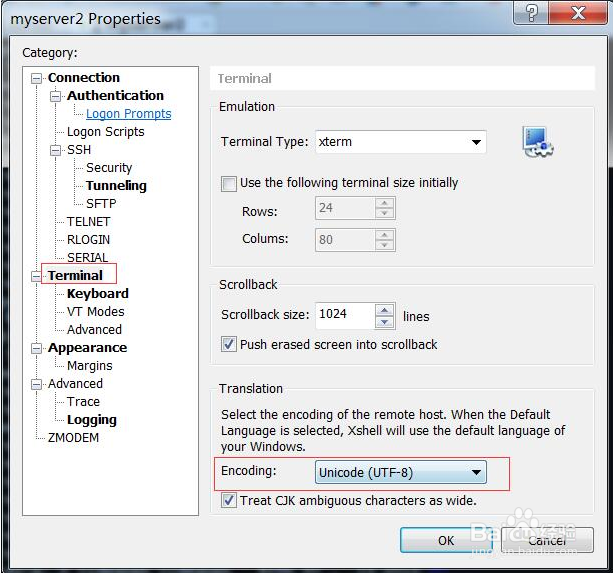 找到Terminal单击,下方选择Encoding,选择UTF-8即可拉