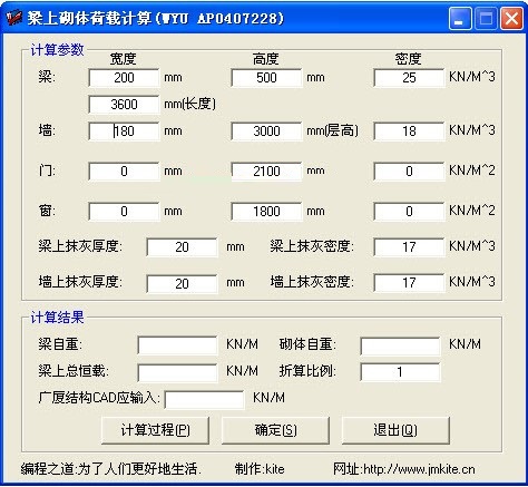 1、输入梁、墙、门、窗的宽度、高度、密度后。2、可直接计算出梁自重,砌体自重等,非常方便。