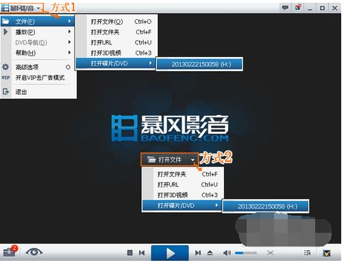 1、打开暴风影音后,打开方式有两种,方式一是左上方“暴风影音”的下拉菜单,选择“文件”-“打开在碟片/DVD”,选择软件自动找到的DVD盘;方式二是初始界面中间的“打开文件”下拉菜单,选择“打开在碟片/DVD”下的如“201302221150058(H:)”。