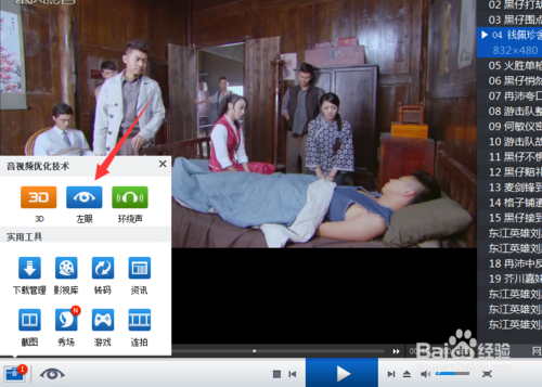 在正常界面下,我们进入播放页面,点击暴风影音5左下角眼睛图标直接就可以了。虽然影片效果有所提高。但没有手动操作的效果好。