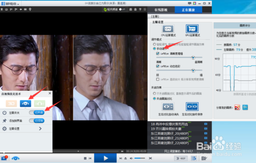 4、如图开启左眼开关。并点击下面的左眼设置。会跳出一个大菜单。这里我们用手动调节 ,可以看到右边数据了吧。同时播放影片界面。画质不用我多说了吧。自己看,有高清的感觉了!右边的原片。