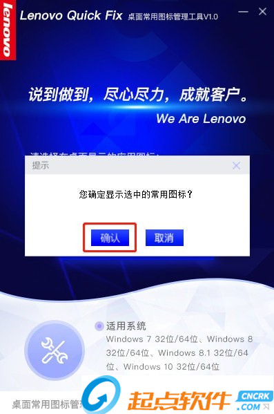 弹出“您确定显示选中的常用图标?”的提示,选择“确认”按钮,继续,如图: