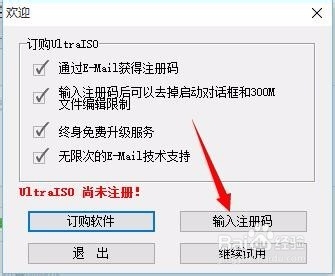 2、安装完成之后我们需要输入注册码才能使用UltraISO,因为这是一款收费的软件,点击右边的输入注册码然后点击确定即可,之后再重新打开UltraISO软件就可以使用了。