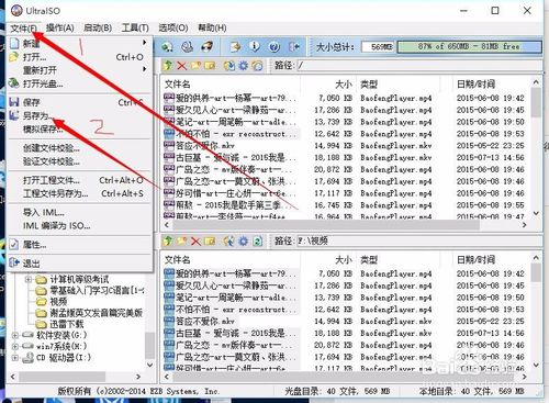 5、在刻录到光盘之前首先得要将文件统一保存为ISO格式才能刻录到光盘中,点击左上角的文件选择另存为,之后在保存的框框中点击左边选择你要存储的位置在文件名中输入名称(后缀.iso保留)保存类型为标志ISO文件,再点击保存即可,这是正在转换为ISO格式的文件。