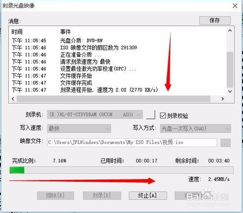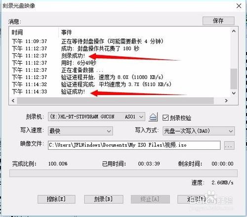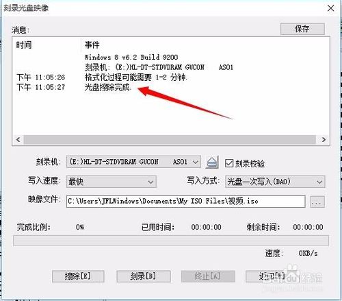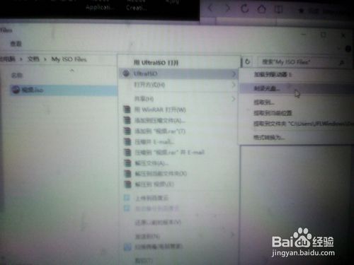 6、找到刚刚创建的ISO文件,右击ISO 文件然后鼠标移动到UltraISO点击刻录光盘(或者是右击ISO文件用UltraISO打开再点击中间的刻录光盘的图标),之后在刻录的时候先点击擦除(相当于格式化光盘,如果不先擦除则会提示这个光盘有数据)再点击将刻录校验选勾(刻录校验是为了保证刻录结果的完整性),然后点击刻录,这时只要等待片刻即可刻录完成。