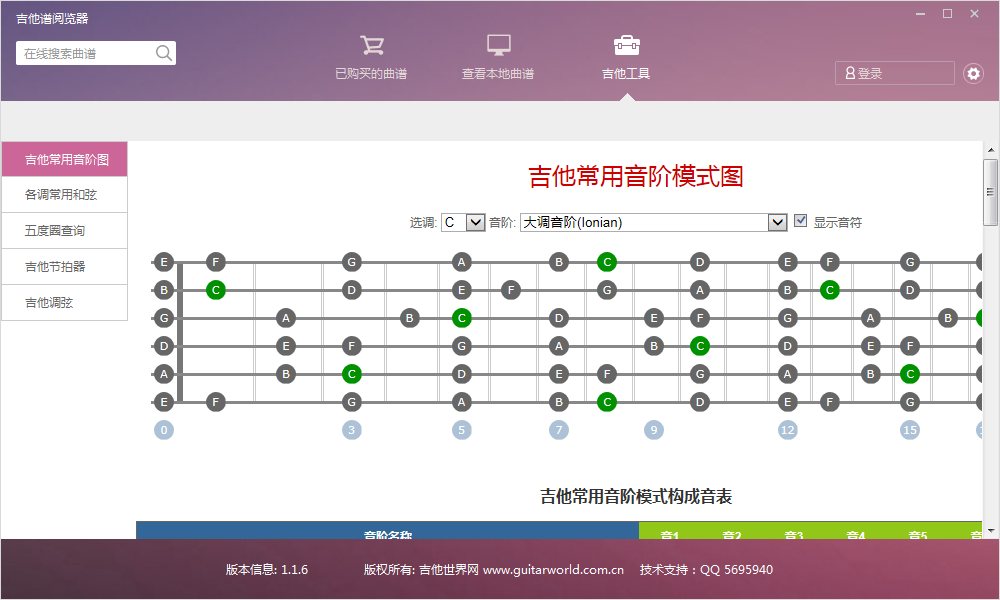 吉他谱阅览器内置了吉他谱常用工具,如:吉他常用音阶图、各调常用和旋、五度圈查询、吉他节拍器、吉他调弦等;