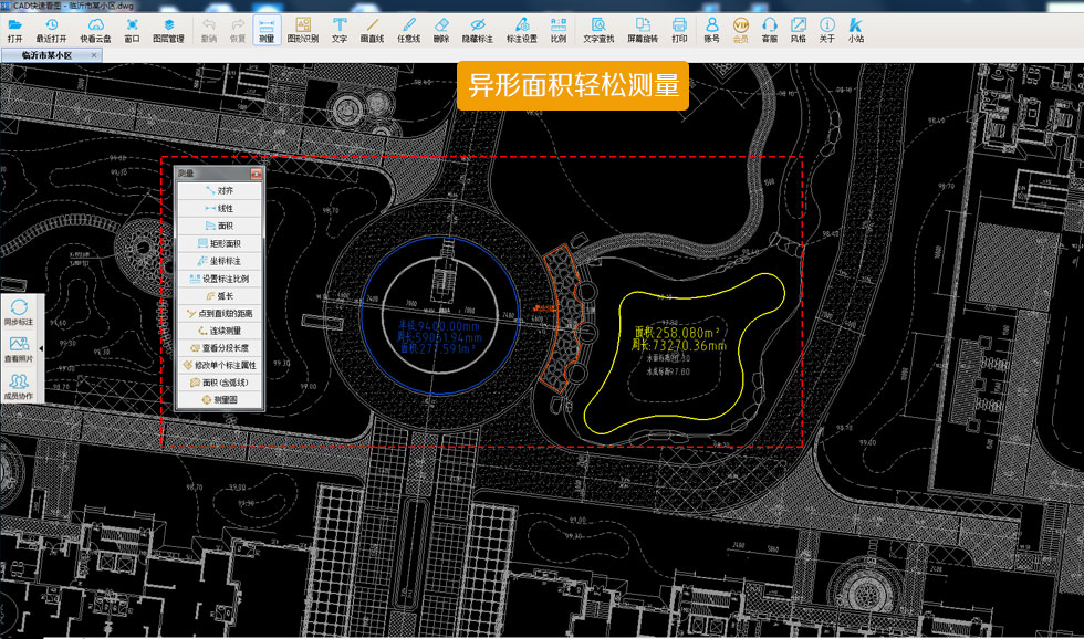 cad快速看图破解版vip会员终身版带弧线的图形怎么测量面积?1.选择“面积含弧线”功能