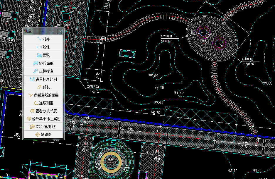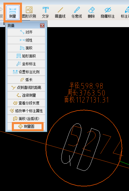测量功能下拉菜单中有个功能叫“测量圆”,点击功能后,鼠标放置在圆形上会变成“回”,变了之后点击,就能拾取圆形测量出面积、周长、半径。