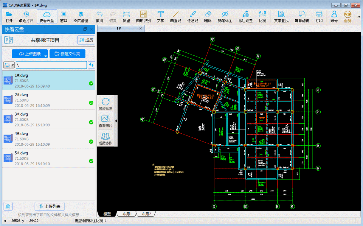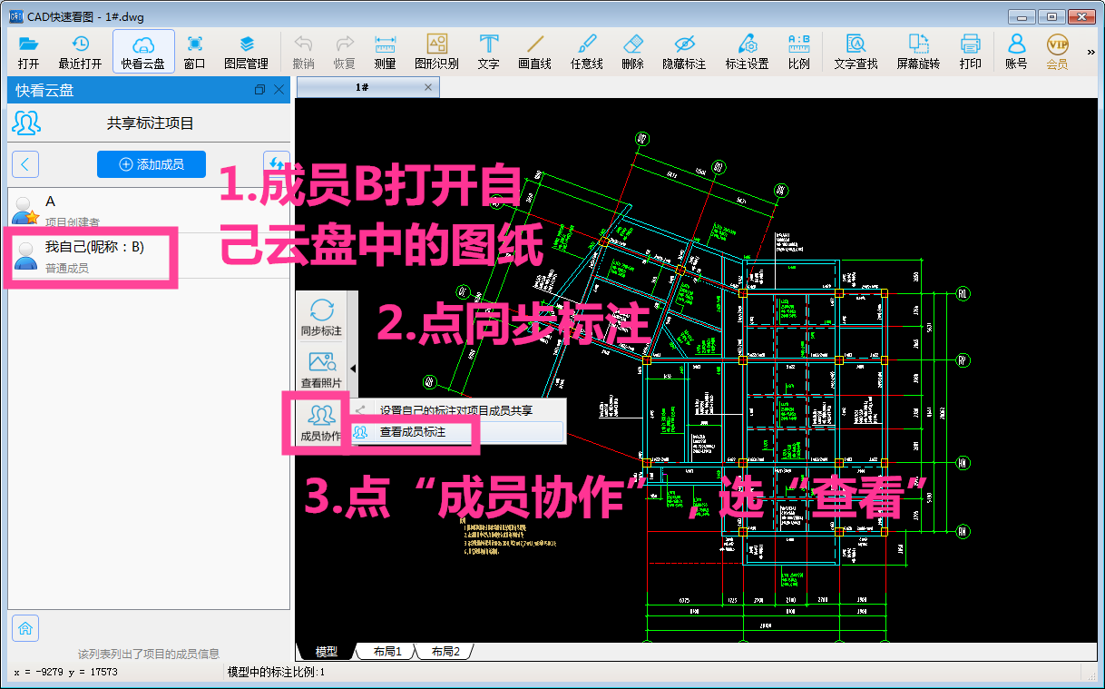 设置成功后,对方登录他自己的账号,就能从云盘里看到这个图,他点一次“同步标注”,再点“成员协作”-“查看成员标注”就可以了