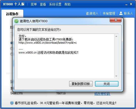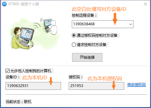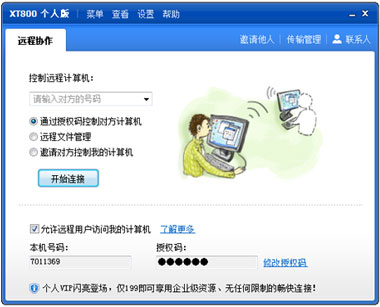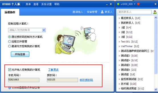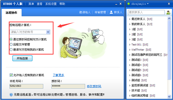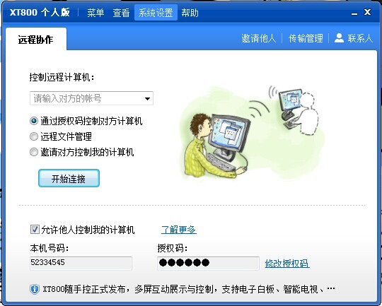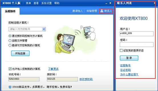 登陆账号之后记住受控电脑的本机号码和授权码,在主控电脑使用xt800个人版免费账号登陆,在输入即可远程。