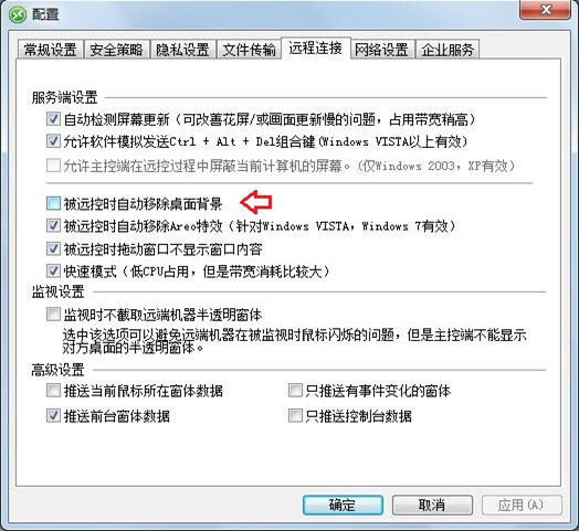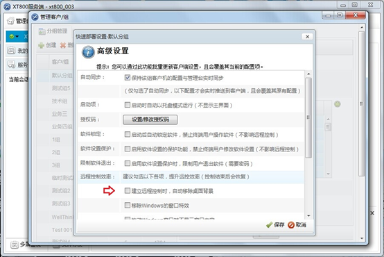 进入“分组管理”之后选定需要修改的分组,进入“高级设置”,选择“远程控制效率”第一栏下方的“建立远程控制时,自动移除桌面背景”,勾选保存即可。