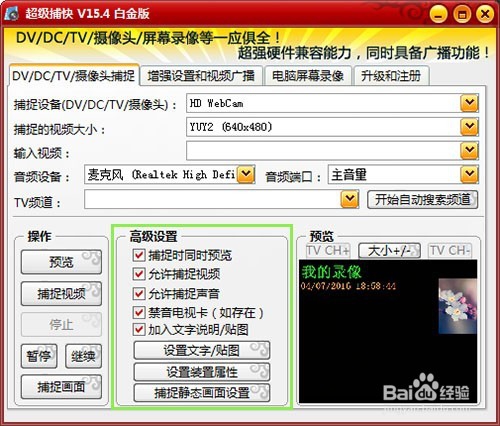 在“高级设置”栏中,我们还可以给视频添上日期、水印、文字等信息,设置装置的对比度、亮度等属性,或是点击“捕捉静态画面设置”按钮,捕捉精彩的静态画面。