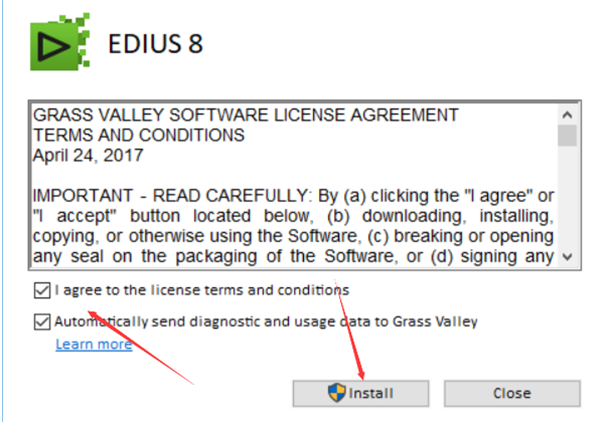 1、首先我们需要在本站下载EDIUS PRO8软件包,下载完成后得到exe安装文件,我们鼠标左键双击exe文件就可以进入到下图中的界面,我们需要先点击点击界面的我接受,然后在点击下面的install开始安装。